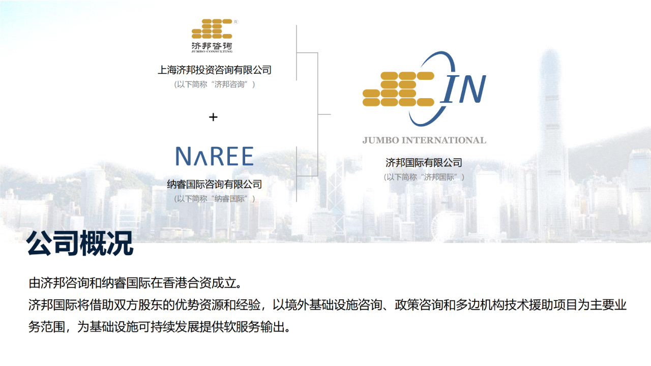上海濟(jì)邦投資咨詢有限公司 (“濟(jì)邦咨詢”或“濟(jì)邦”) 是一家提供綜合性專業(yè)服務(wù)的基建咨詢機(jī)構(gòu)。 自2002年成立以來(lái), 濟(jì)邦為基礎(chǔ)設(shè)施相關(guān)的各級(jí)政府、 投資運(yùn)營(yíng)商、 工程承包商、 金融機(jī)構(gòu)等市場(chǎng)主體提供從規(guī)劃研策、投融資交易、建設(shè)交付管理、監(jiān)管優(yōu)化,直至運(yùn)營(yíng)維護(hù)及資產(chǎn)管理的全壽命期或分段分項(xiàng)咨詢服務(wù)。遍及單體項(xiàng)目、片區(qū)園區(qū)及城市開(kāi)發(fā)建設(shè)和管理。